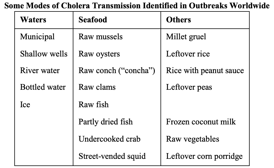 V. cholerae is transmitted through contaminated food or water. The source of contamination is usually through the feces of cholera patients. 1